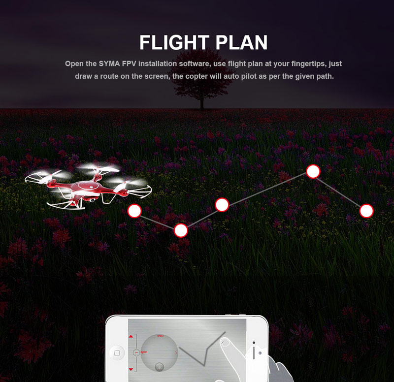 This Syma X5UW Wifi FPV drone is equipped with 2.4G 4CH transmitter and 6-Axis gyro for your easy and stable control, 720P HD camera and WIFI real-time images transmission system for fantastic video/picture taking, which is really a great flight combination. Moreover, it is fantastic with functions of high/low speed switch mode, flip mode, headless mode, and one key take off/landing. Just come and get it!